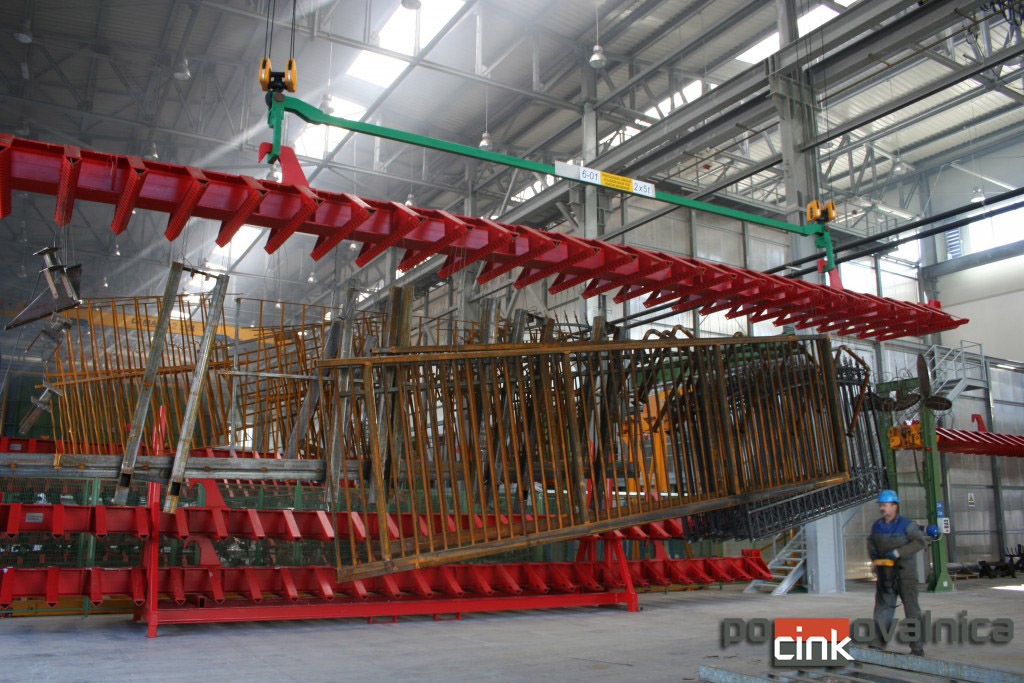 V tej fazi se elementi obešajo na posebne gredi s pomočjo žice ali verig. Naložene gredi se skozi cel postopek transportirajo z dvigali. |
